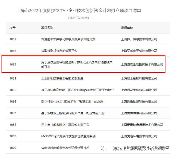 近期,上海市科学技术委员会组织的“上海市2022年度科技型中小企业技术创新资金计划”拟立项项目名单公示完毕,尊龙凯时z6com生物“用于治疗重度哮喘的全新长效IL-5纳米抗体药物的临床前开发”项目入围。